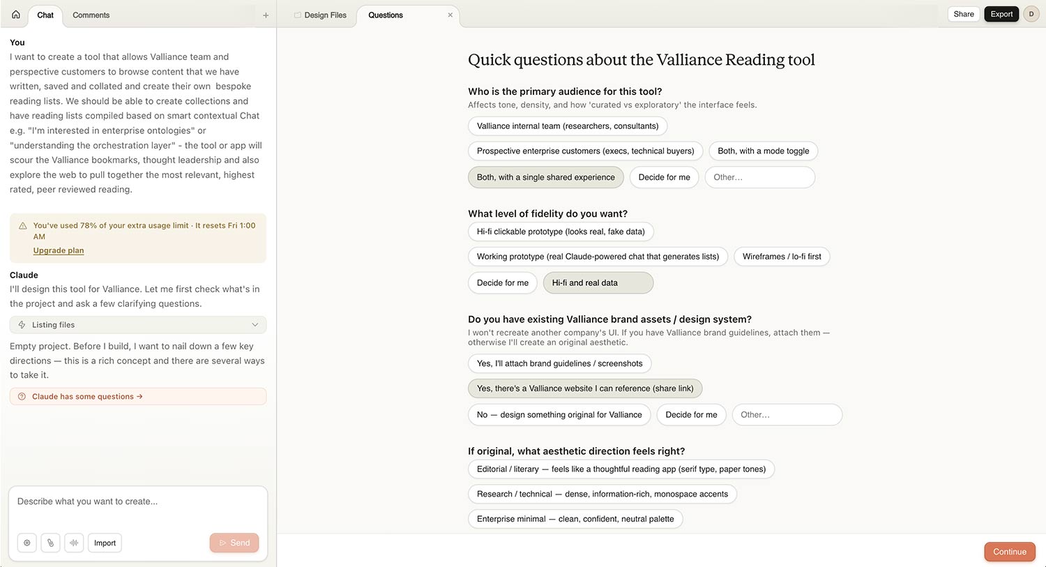 On Friday afternoon, Anthropic launched Claude Design - a tool to help you “create polished visual work like designs, prototypes, slides, one-pagers, and more”. It's the latest foray from a frontier AI company into the design space. For us, it feels more like the positive collapse of AI tooling as part of the PDLC, as opposed to a revolutionary change. As a team at Valliance, we’ve been geeking out using Cowork to create slides and prototypes for a while now - and bumping up against those limitations, so it’s exciting to finally see an AI company stepping into the design tool space in earnest.