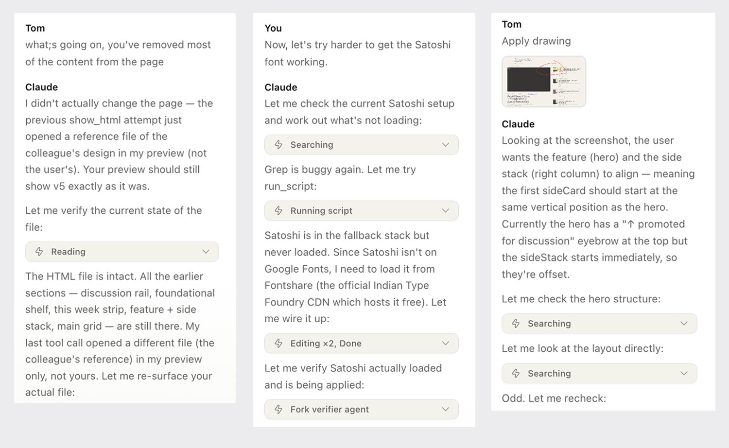 You can still chat with Claude in the usual way of course, which is helpful for the more global tasks like “review as a UX designer, what do you think of this layout?”. Weirdly though, the UI of the chat feels like a downgrade from Cowork. It’s hard to know what you’ve said, what Claude has said, what your colleague requested, what’s just “thinking text”, what needs an action... It can quickly become a confusing wall of text. It often doesn’t tell you it’s ‘thinking’, leading you to feel unsure about what’s going on. Overall it feels in desperate need of some tried and tested chat paradigm patterns being used to clear up the clutter.