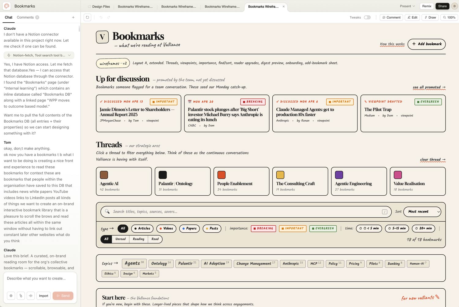 Back to the task in hand - Tom went wireframes-first, then applied the Valliance website UI on top. The first pass was overcrowded and messy - typical generative AI creation of about 40% too much stuff. In the old world, during very initial stages, some core decisions can be assisted by showing very big simple boxes on the page with a label - “navigation”, “hero carousel”, “latest products”… etc. It would have been helpful to have a similar step here, to help really hone down the busy page content early on before getting to the content overload. By the third pass and honing down, it was actually useful, pulling Notion data in cleanly, showing flags and comments and time-to-read estimates. The end result was still complex, far from shippable, but full of ideas and inspiration to build from.